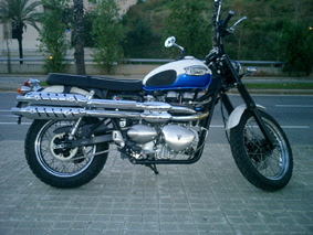 Ya llevábamos meses decididos a comprarnos una gran moto y barajábamos entre la BMW R1200GS o la R1200GS Adventure. Pasaban los meses y me iba impacientando. Ya era verano y no estábamos disfrutándolas. Tras las vacaciones decidí comprarla con Jose o sin él y en la última llamada que le hice me dijo: "¿Has visto la nueva Triumph Scrambler?". Con toda sinceridad no sabía de que me estaba hablando. Me dijo algo así como que era una Trail pero retro, con aires de Steve MacQueen en "La Gran Evasión". No me la imaginaba, así que arranqué para el concesionario Triumph más cercano. Estaba cerrado. Tenía que volver al día siguiente y mi impaciencia iba en aumento. Todo eran cábalas pensando en que con las BMW nos caeríamos de cabeza puesto que son demasiado altas para nosotros, y que con tanta tecnología en el primer río que cruzáramos seguro nos quedábamos tirados. La Scrambler es pura mecánica y cualquier manitas te la arregla aquí o en Bolivia. (Bolivia, esa es otra historia...) Y llegó el día: ya sé a que se le llama "amor a primera vista". Sólo verla supe que esa iba a ser MI moto. Esos cromados potentes, ese motor de avión, esas ruedas de tractor... Lo llamé y le dije que sí, que estaba totalmente fascinado con la moto y que a comprarlas cagando leches. Consultamos precios y condiciones en los dos concesionarios oficiales Triumph de Barcelona y nos decantamos por ITALO MOTOR, donde Christian nos trató de lo más bien y creo que conectamos enseguida. Todo fueron facilidades. De cabeza al banco a conseguir la pasta, y mientras tanto que si la roja para tí y la azul para mí, que si al revés, que si volvemos a cambiar... La verdad a mí me daba igual el color. Las dos son igual de preciosas. Jose siguiendo su tradición finalmente se quedó con la de color rojo Tornado. Yo la azul Caspio. Sin probarlas siquiera compramos 2 auténticos bellezones.