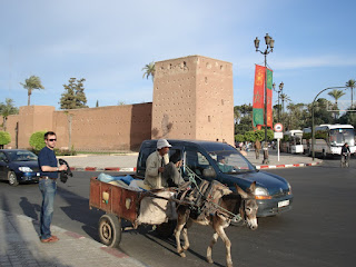 Nos levantamos con el ánimo traquilo y sin demasiadas prisas para ir a desayunar por los alrededores de la Plaza Jbel-el-Fnaa y tomerle el pulso de nuevo a la ciudad. Asaltar de nuevo el tráfico marrekechiano es una aventura extraordinaria y estaba ansioso por repetir la proeza de sortear carros, motos, guaguas y demás. Queremos sacar unas fotografías de las motos en pleno centro de Marrakech pues el comportamiento de ambas ha sido tan extraordinario durante todo el viaje que bien se merecen ser inmortalizadas en tan bonito lugar. El centro bulle de gente ya desde buena hora de la mañana y tenemos que ir rodeando la plaza hasta encontrar una cafetería con asisntos libres. Finalmente encontramos una y nos sentamos a tomar un delicioso té a la menta, no habían pastelitos para acompañar. Jose Luís recibe una llamada de teléfono comunicándole un grave asunto familiar y le propongo dar por terminada la aventura. Nuestro objetivo estaba sobradamente cumplido y los dos dias que nos quedaban podian tranquilamente sacrificarse, así que acordamos salir echando para Tánger para cruzar el estrecho esa misma noche o máximo a la mañana siguiente.