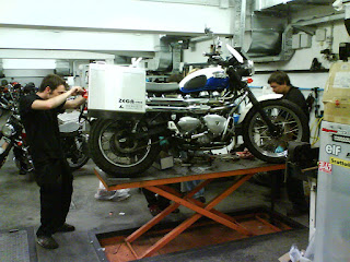 Por fin ya tenemos las motos preparadas. En Italomotor les han hecho una puesta a punto de primera y ahora rugen finísimas. Ya las estamos probando para acostumbrarnos al nuevo ancho, ¡ahora sí que no podremos zigzaguear entre coches!. Están súper bonitas y ya el lunes empieza el festival de pegatinas para esas maletonas tan chéveres. El faro de xenon es una pasada. ¡De noche se hace de dia!