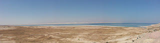 De repente aparece ante nosotros el Mar Muerto, grandes maquinarias de extracción y proceso de sal y potasio y vamos bordeando este mar, precioso a la vista, desde la carretera que recorre sus acantilados (bastante pronunciados por cierto). No se puede bajar a remojarse de ninguna manera. Al otro lado Israel. Las rocas tienen un ribete blanco de sal allá donde el agua las toca. Para los amantes de los cómics de Batman pasamos por un punto llamado "Ra's Al Ghoul". Secreto descubierto. Ya sabemos de dónde sacaba Ra's sus baños curativos e inmortalizadores.
